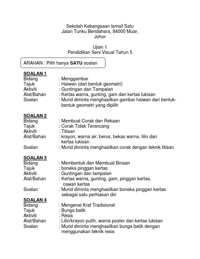 Soalan Pendidikan Seni Visual Tahun 5 Pdf